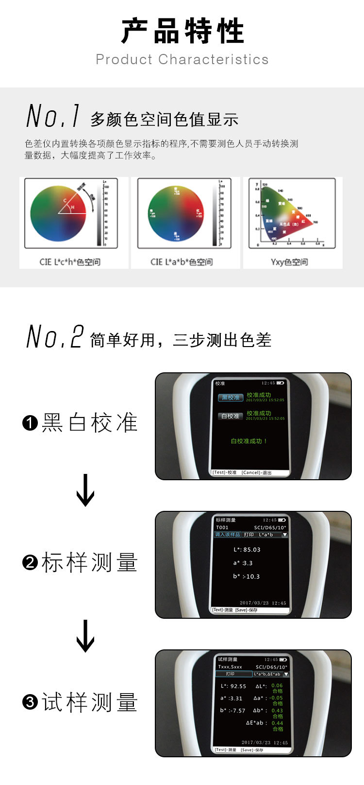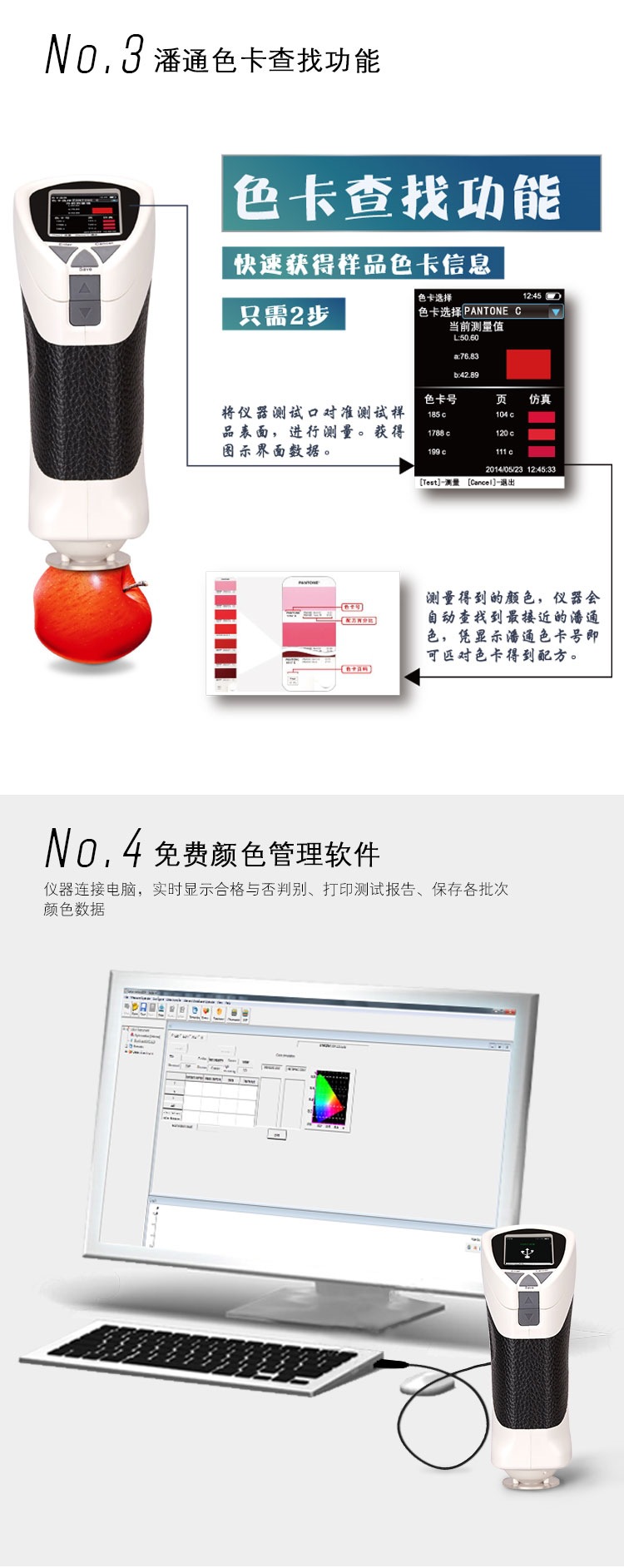 CS-260潘通色卡讀數儀能讀取樣板顏色并能顯示zui相近的潘通色卡號,廣泛應用于塑膠、印刷、油漆油墨、紡織、印染服裝等行業的顏色管理*域,根據CIE色空間測量樣品色值L*a*b、L*c*h,與被測樣品的色差△E以及 △Lab值。