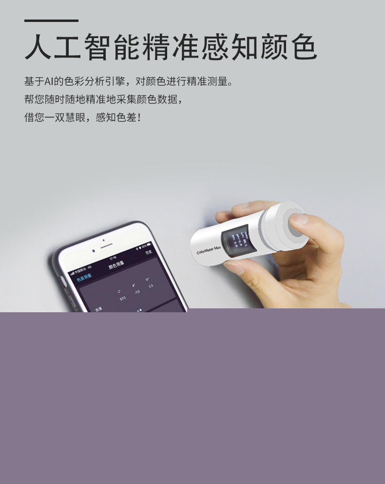色差寶ColorMeter MAX是色差寶系列的增強版儀器,是色差儀*域一款強大的測色工具,優秀的性能配置,讓色彩測量更準確;與安卓或IOS設備無線連接,極大的拓展了顏色測量儀器的應用邊界;它將帶您進入色彩管理新世界,可替代印刷、涂料、紡織等色卡,實現顏色讀取、色卡查找功能;儀器可過G家二級計量,測量穩定性小于等于0.05,優于色差寶ColorMeter Pro。