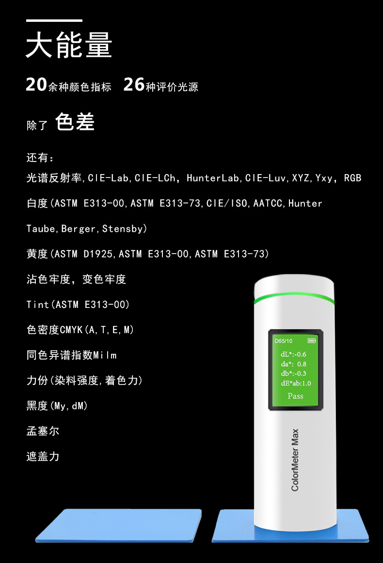 色差(ΔE*ab,ΔE*cmc,ΔE*94,ΔE*00),白度(ASTM E313-00,ASTM E313-73