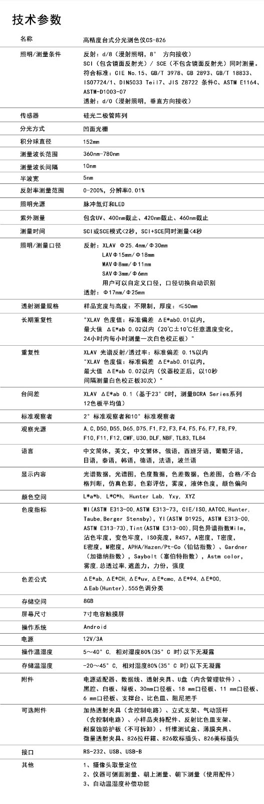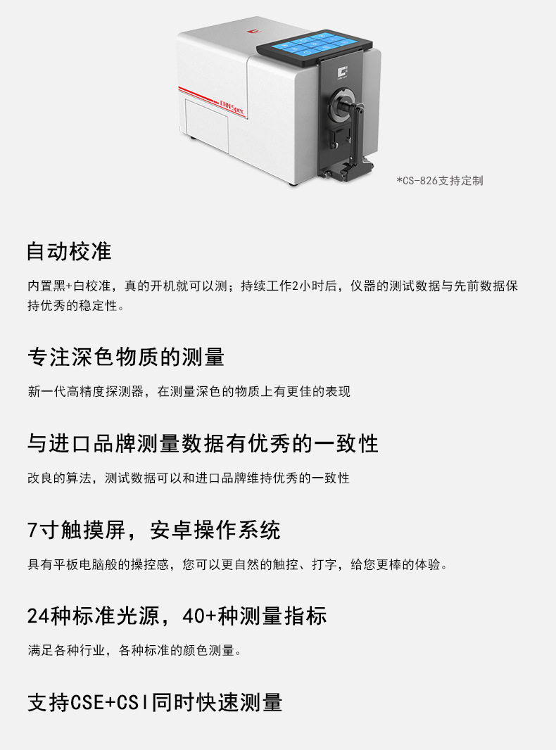 高精度臺式分光測色儀CS-826是一款高精度、高穩定性的顏色測量儀器;先進的工藝技術,強大的數據處理器,讓CS-826在黑色物體的顏色測量上具有優秀的表現;儀器的自動校準,保證了長期測量的穩定性;改善的照明光源,在測量熒光和可見光上都有驚艷的展現,且儀器測量數據能與進口品牌維持優秀的一致性。