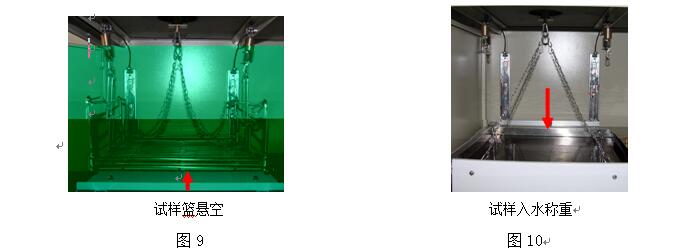 ⑵ 推動(dòng)上活動(dòng)托板,讓車(chē)轍試件置于電子天平正下方,將方形網(wǎng)籃上的2個(gè)帶不銹鋼鏈子的S形掛鉤掛在電子天平下方的保險(xiǎn)掛鉤上,見(jiàn)圖8。