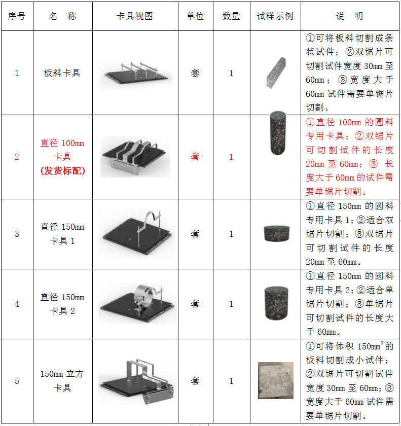 特別說(shuō)明:序號(hào)3、4的試件切割卡具和鋸片切割墊塊為本儀器出廠標(biāo)準(zhǔn)配件,用戶的特殊需求試驗(yàn)器具可根據(jù)本說(shuō)明書(shū)附錄“儀器試驗(yàn)器具”的介紹另行選購(gòu)